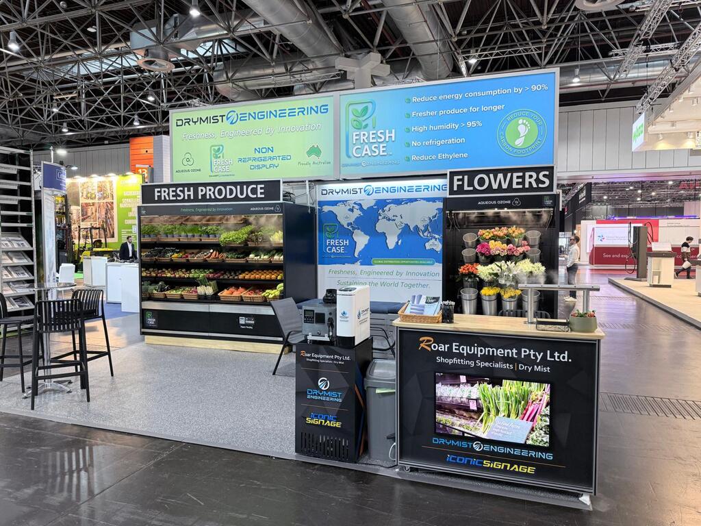 Our stand demonstrated how RO-purified water, on-demand electrolytic ozone, and ultrasonic Dry Mist technology combine to deliver advanced hygiene protection, shelf-life extension and reduced shrink across retail environments.